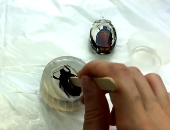 5、然后再硅膠模具上面鋪上小半層膠水,把蟲子放入里面。
